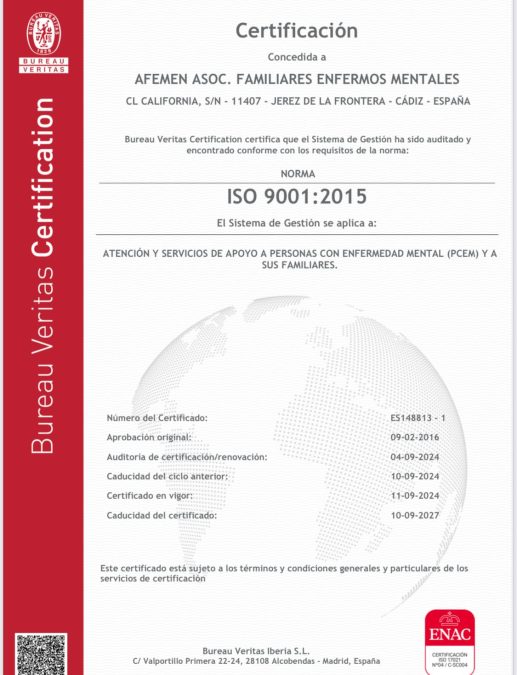 Nuestra Asociación reafirma su compromiso con la calidad en la atención a las personas usuarias y sus familiares, a través de la certificación de los procesos de gestión, coordinación y administración, por parte de la consultora autorizada, Bureau Veritas.